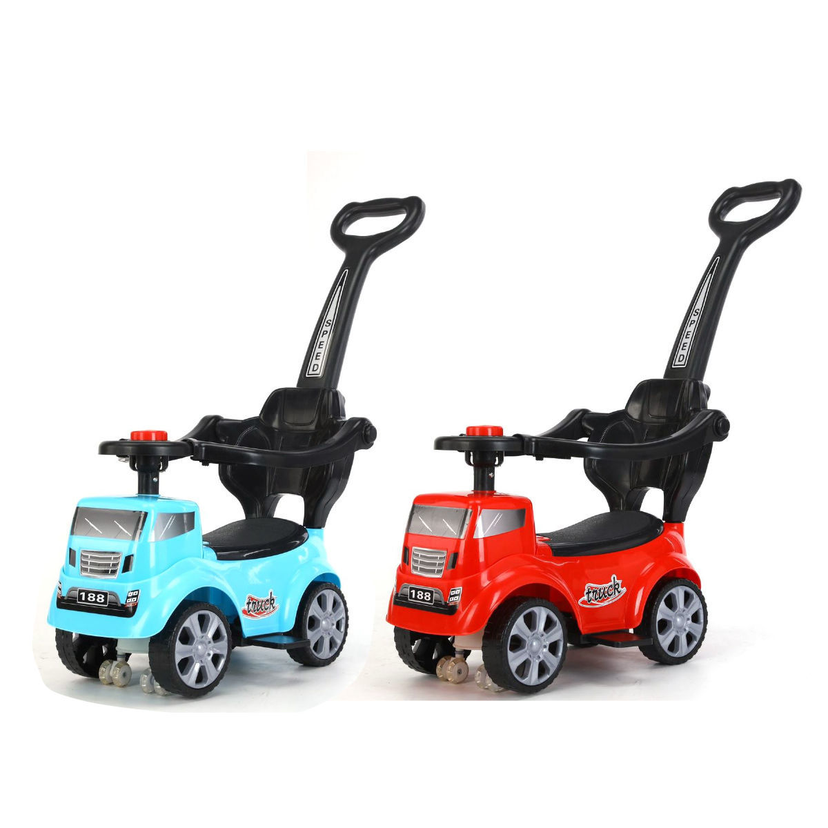 Bugui de plástico con doble barra, una de seguridad y otra fija, bocina y baúl para guardar juguetes. Tiene 4 ruedas interiores que giran en sí mismas y 4 ruedas exteriores fíjas de adorno. Colores disponibles: amarillo, azul, rojo. Presentación en caja. Medidas: 36.5x59x79cm