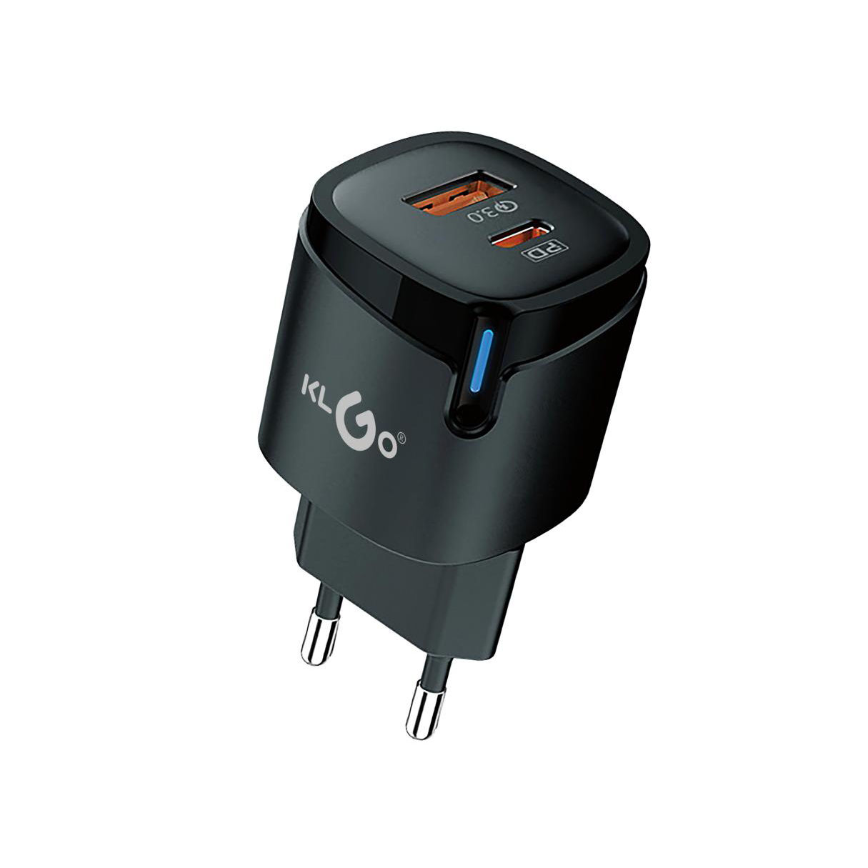 Cargador con entrada USB-C y USB-A, 30W, KLGO, en caja