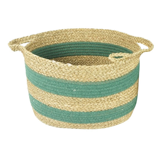 Cesto canasto franjas verdes chico, de fibras naturales, junco de agua