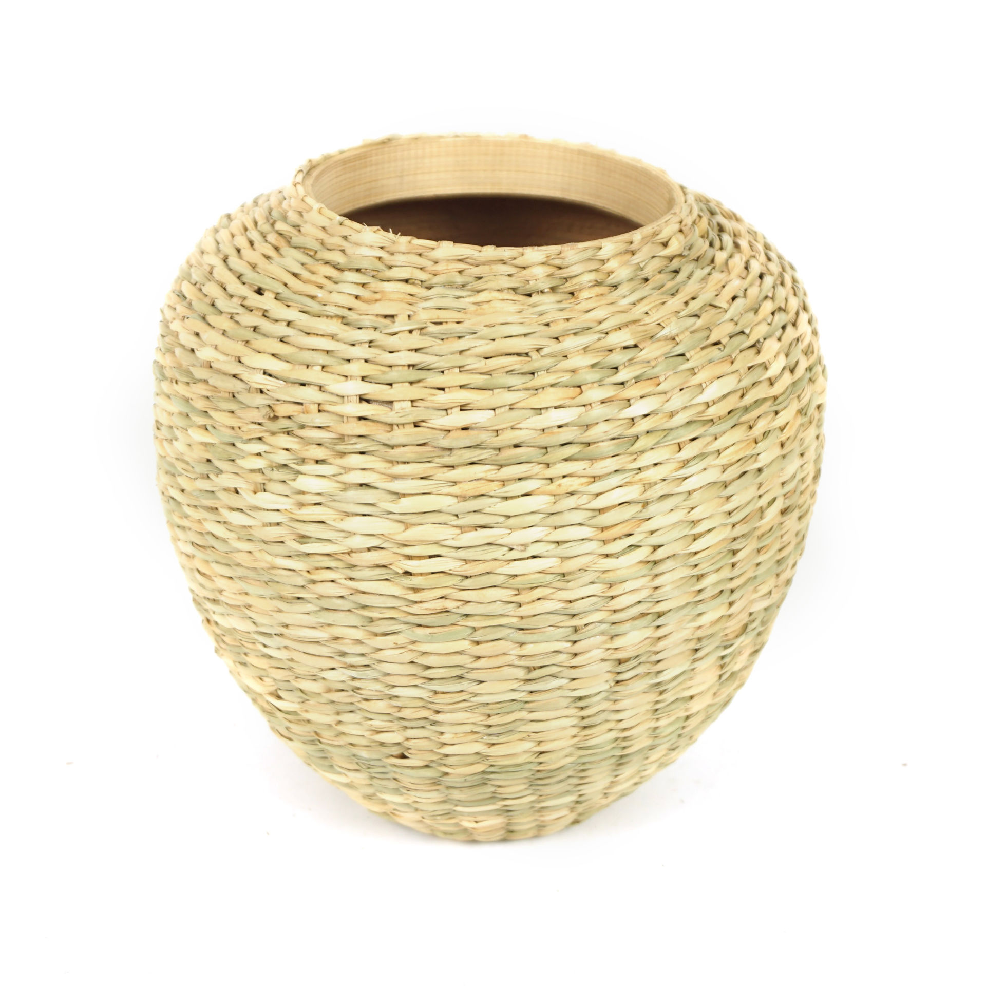 Decora tu hogar con estilo y rusticidad con este hermoso florero de fibras naturales, junco de agua. Medidas: 23x22cm.