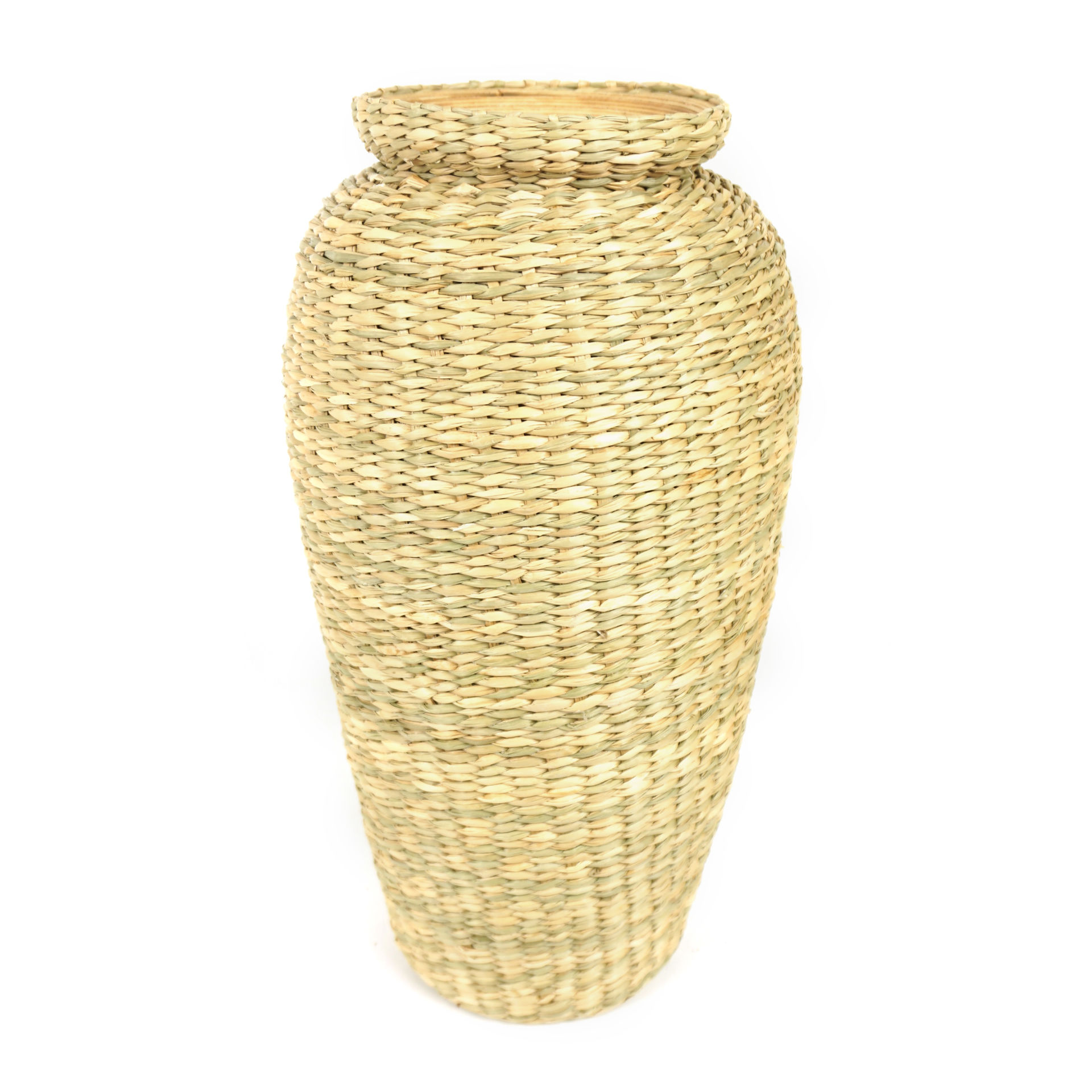 Decora tu hogar con estilo y rusticidad con este hermoso florero de fibras naturales, junco de agua. Medidas: 22x30cm.