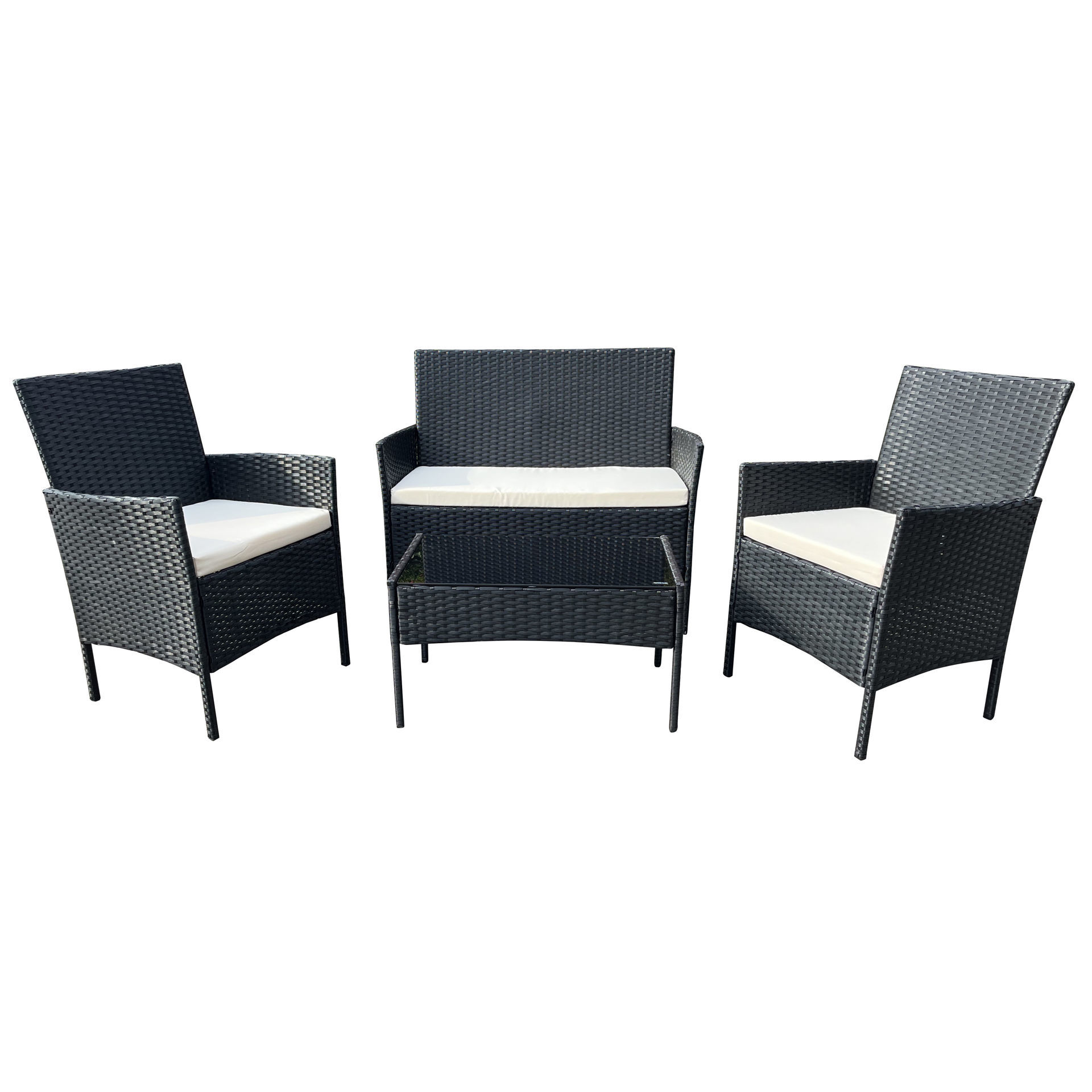 Decora tu jardín con este juego de ratán. Cuenta con 1 sillón de 2 cuerpos, 2 sillones de 1 cuerpo y una mesa. Todo el juego es de color negro y aporta estilo a tu hogar. Fabricado en ratán con almohadones de lona sintética. Color negro.