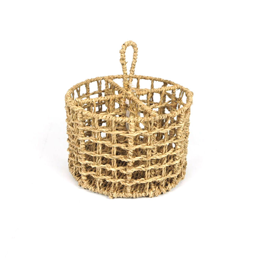 Dale un toque rústico a tu hogar con este canasto organizador, 4 reparticiones, calado con asa de fibras naturales, junco de agua. Medidas: 20x13.5cm.