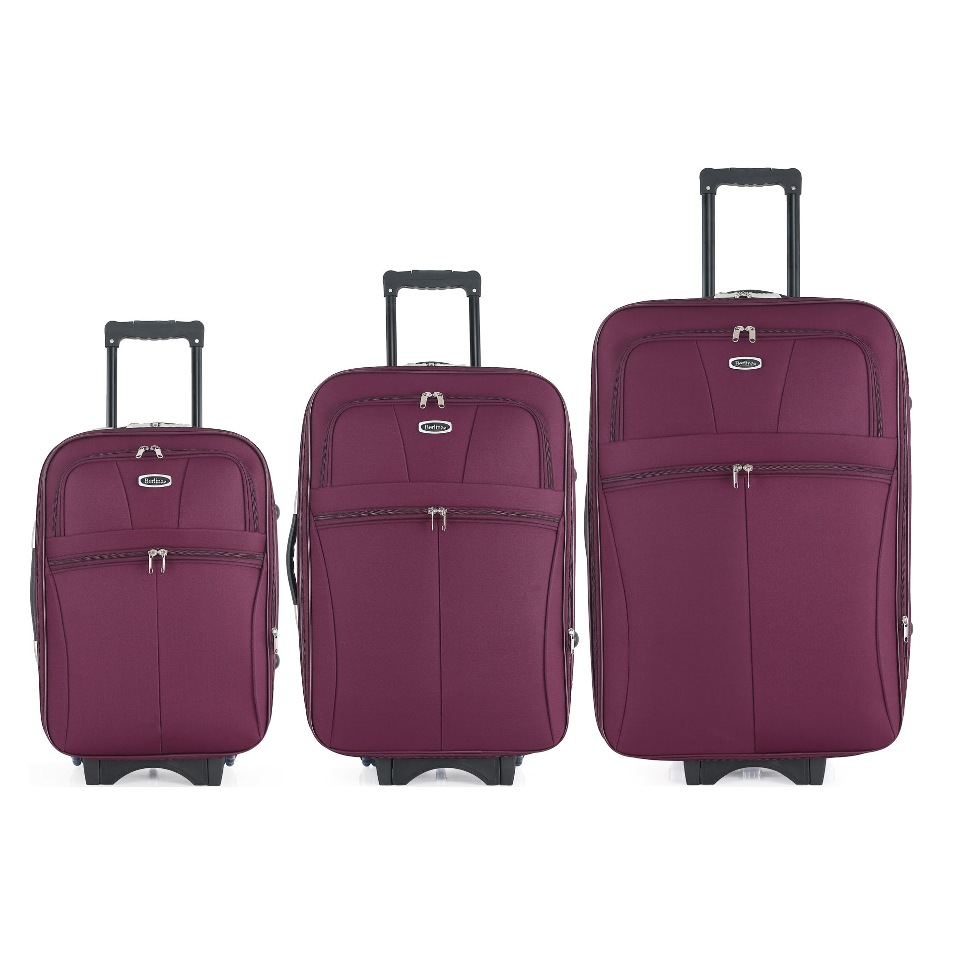 Valijas Berlina Set x3 en varios colores; azul, negro y rojo. Valijas super resistentes semi rígidas, equipada con ruedas en línea, fuelle 5cm con base extensible, 2bolsillos exteriores, manija telescópica, tranca numérica, correa para ajustar ropa, bolsillo interior con cierre.