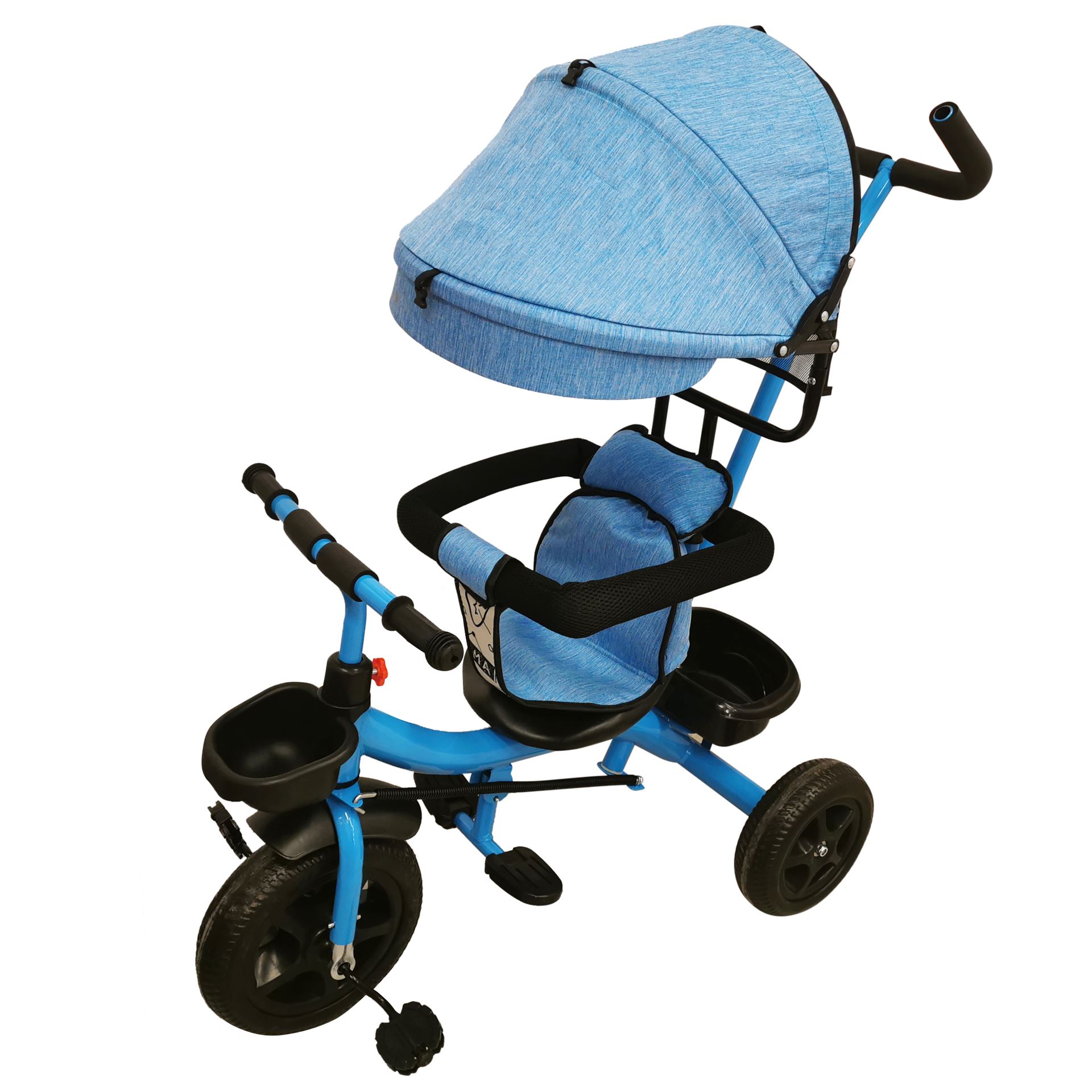Triciclo con capota, barra móvil, barra de seguridad y apoyapies retráctil. Cuenta con dos canastos, uno frntal y otro trasero. Estructura de metal y tela. Medidas: 47x78x100cm. Color: azul