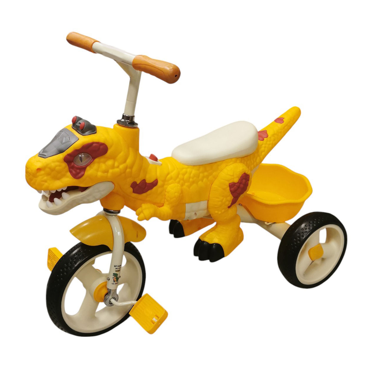 Crea divertidas aventuras para los más pequeños con este triciclo dinosaurio, ideal para pequeños aventureros. Equipado con luces en los ojos y sonidos de dinosaurios que le darán una emoción superior a sus aventuras. Es perfecto para desarrollar habilidades motoras mientras disfrutan de su paseo. Funciona con 3AA. Cuenta con un canasto trasero para que puedan llevar sus juguetes favoritos. Haz que el juego sea inolvidable con este triciclo lleno de fantasía.