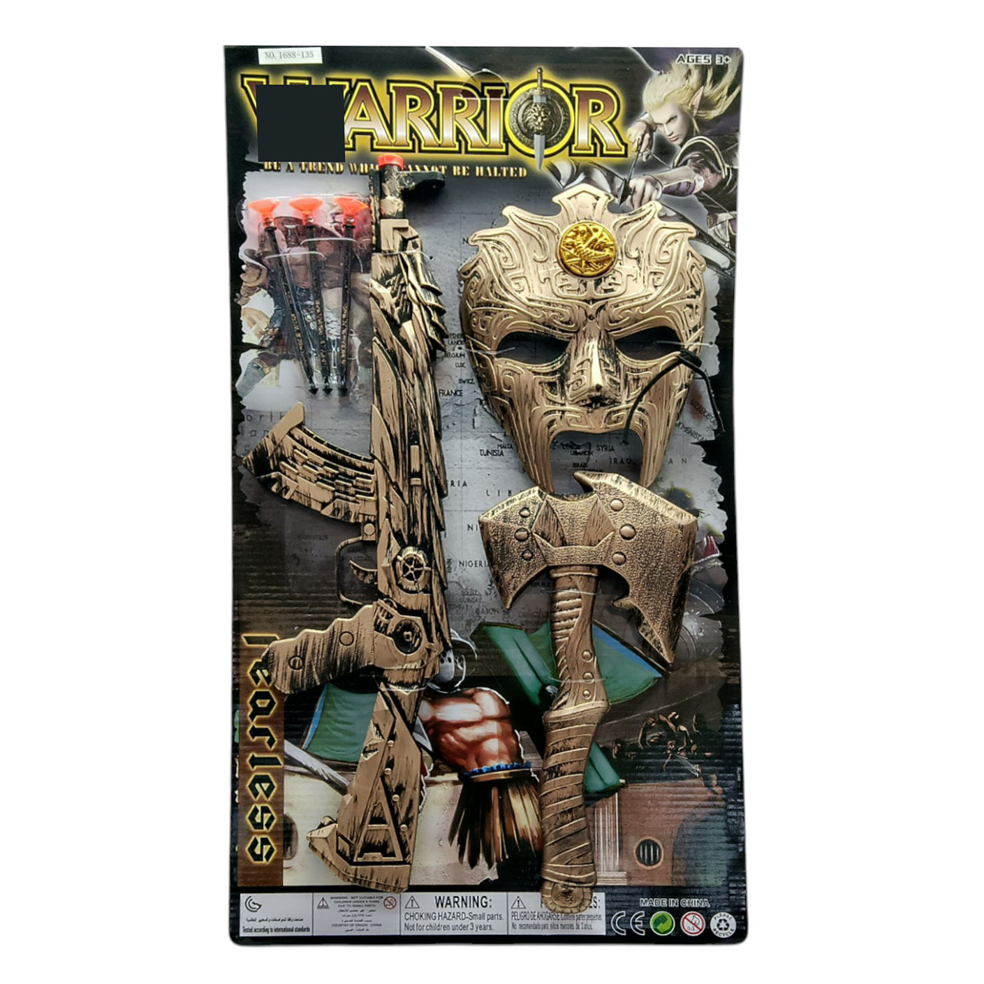 Ametralladora lanza dardos con 3 dardos, máscara y hacha, en cartón
