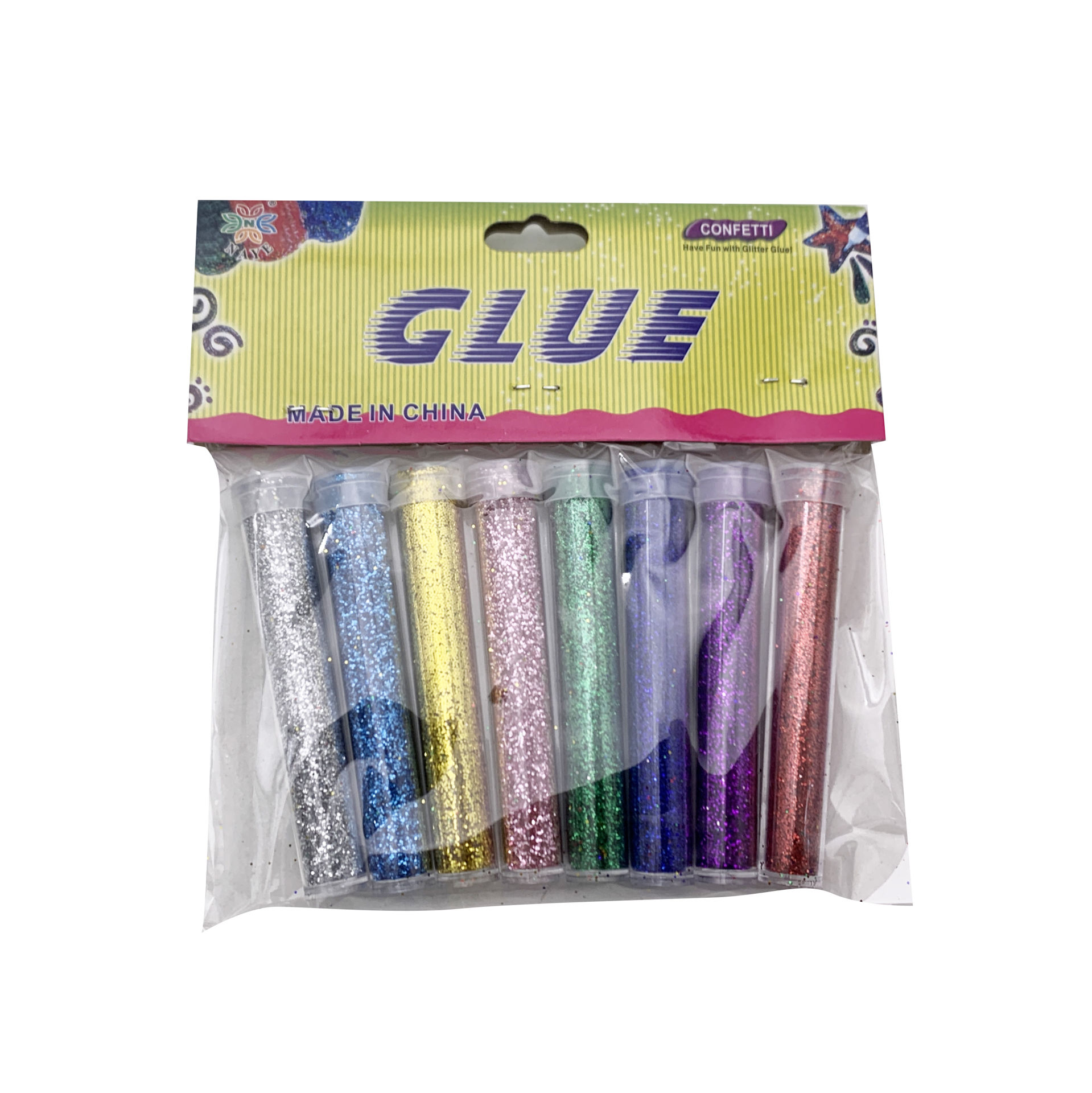 Brillantina fina en tubo, pack x8 colores surtidos. Una linda y brillante opción para las manualidades con los más pequeños de la casa. Cada tubo mide 7.5x1cm. Presentación en bolsa