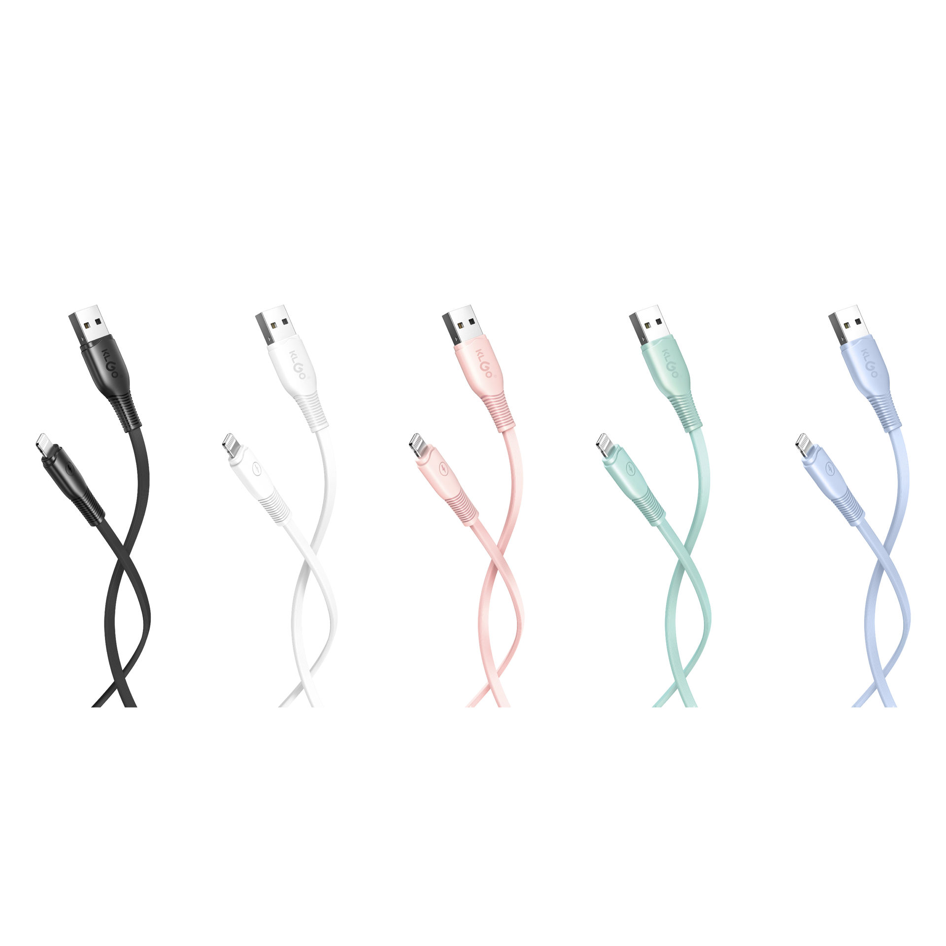 Cable de datos y carga KLGO, USB a Lightning. Cable de 1m de largo. Compatible con iPhone. Colores disponibles: rosado, verde, negro, blanco. Presentación en caja.