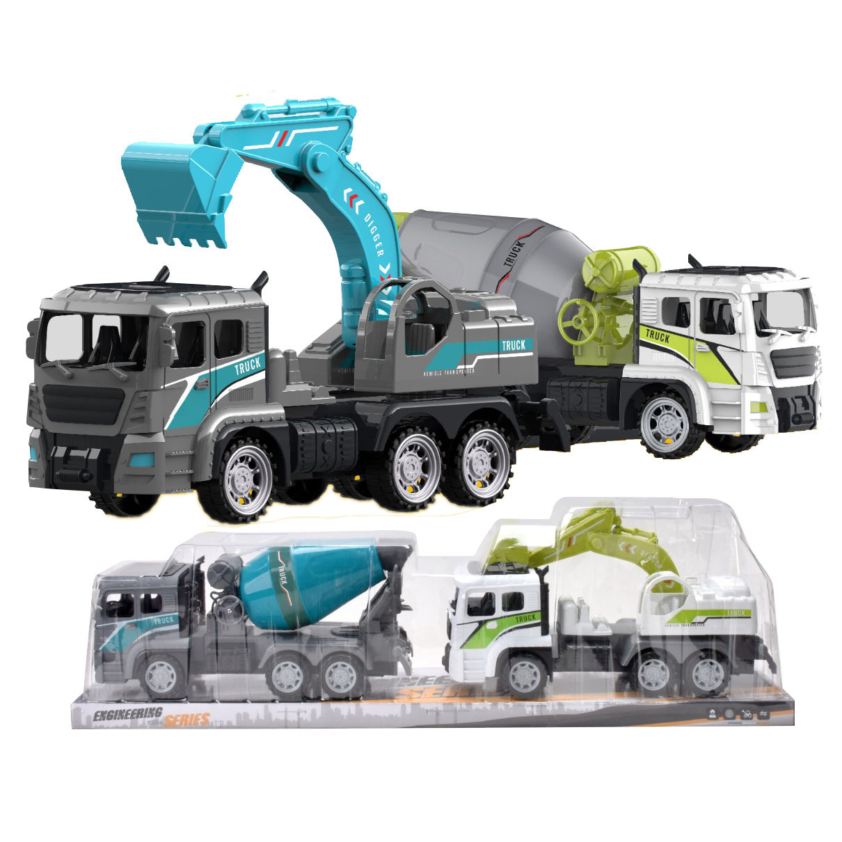 Camión a fricción, x2, mezcladora y pala excavadora, en burbuja