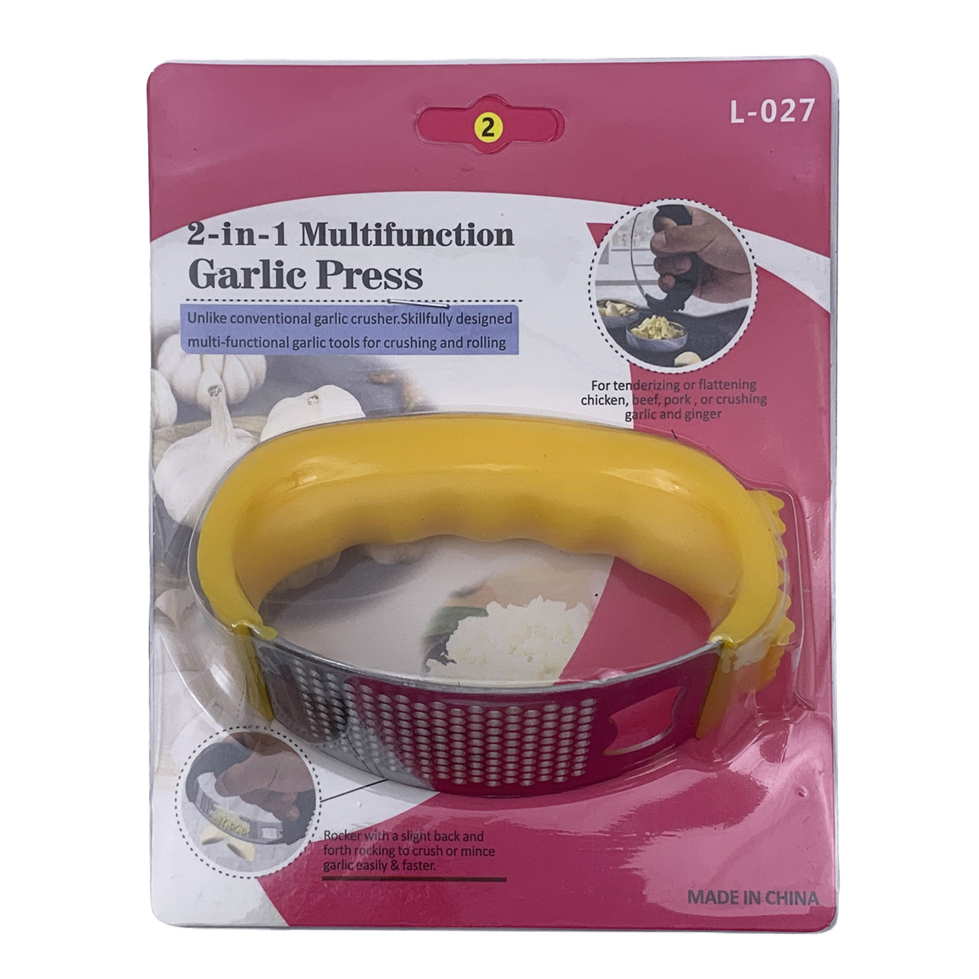 Prensa para ajo, palta o para manteca, en blister, varios colores